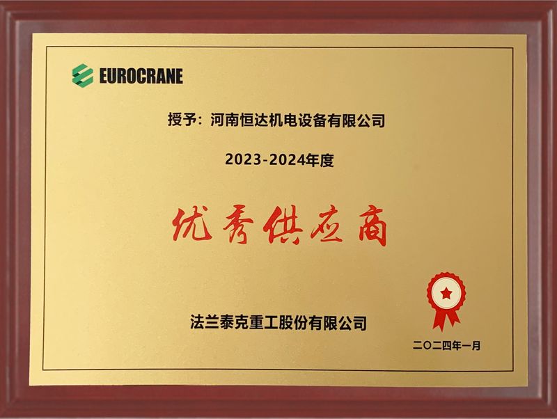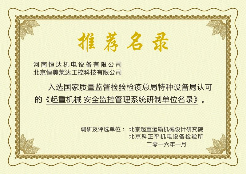 是中國(guó)重型機(jī)械工業(yè)協(xié)會(huì)橋式起重機(jī)專業(yè)委員會(huì)及葫蘆分會(huì)理事單位及多年的優(yōu)秀配套件供應(yīng)商。物料搬運(yùn)工程設(shè)備成套與服務(wù)分會(huì)理事單位,是ISO9001:2008質(zhì)量管理體系、武器裝備質(zhì)量管理體系、歐盟產(chǎn)品CE認(rèn)證及兩化融合達(dá)標(biāo)企業(yè)